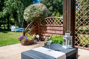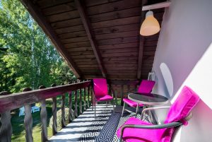 2-pokojowy Apartament składający się z salonu (34,5 m2) z rozkładaną sofą, łóżkiem, stołem i krzesłami oraz kominkiem. W pokoju obok jest osobna sypialnia (10 m2). Apartament posiada kuchnię (8 m2) i łazienkę z prysznicem (4m2) oraz dwa tarasy: przy sypialni od strony zachodniej oraz przy salonie zadaszony od strony południowej. Jest tu bezpośrednie wyjście do ogrodu i blisko plac zabaw.